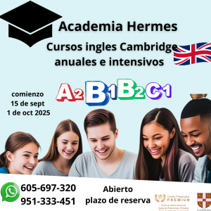 ¡El plazo de matrícula para los cursos de inglés Cambridge 2025-2026 ya está abierto! En Academia Hermes, te ofrecemos una preparación completa y efectiva para alcanzar tus metas. Impartimos cursos anuales e intensivos para todos los niveles, desde Kid’s hasta A1, A2, B1, B2 y C1 • Preparación de calidad: Nos enfocamos en darte las herramientas que necesitas para aprobar tus exámenes de Cambridge. • Apoyo personalizado: Además de los cursos, ofrecemos apoyo en inglés para ayudarte a resolver cualquier duda y reforzar tus conocimientos. • Horarios flexibles: Elige entre horarios de mañana y tarde, diseñados para adaptarse a tu ritmo de vida. • Grupos reducidos: Para garantizar una atención individualizada y un aprendizaje más dinámico. Nuestros cursos comienzan el 15 de septiembre y el 1 de octubre de 2025. ¡No te quedes sin tu plaza!